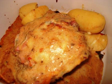 Fatie o lagarto (sem chegar até o final para não separar as fatias) numa espessura de 1cm cada fatia. Coloque no meio de cada fatia, 1 fatia de presunto e 1 fatia de queijo mussarela, até terminar as fatias do lagarto. Ele vai abrindo como um leque. Coloque o lagarto num refratário retangular que possa ir ao forno.